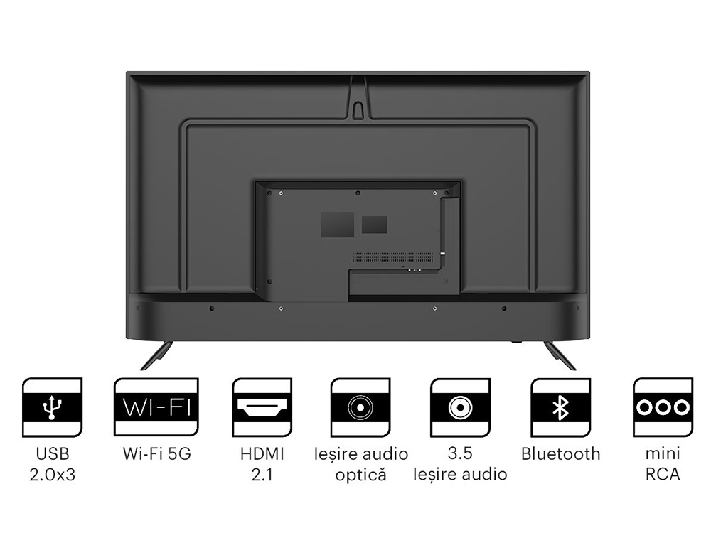 (50' Black 3840x2160 4K UHD, SMART TV (Android TV 9.0 ugradable to ATV 11), WiFi, Headphone jack 3.5 mm, 4х HDMI 2.1, 3х USB, Bluetooth, DVB-T/T2/C, OSD Language: ENG, RU, RO, Sound by JVC, Speakers 2x12W Dolby Audiol, Bluetooth Smart remote control RC60 with Voice control and pointer, VESA 200x200, 10.4 Kg)