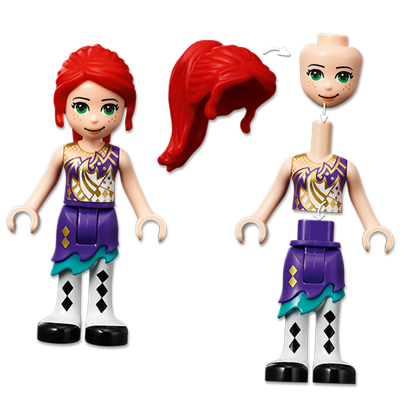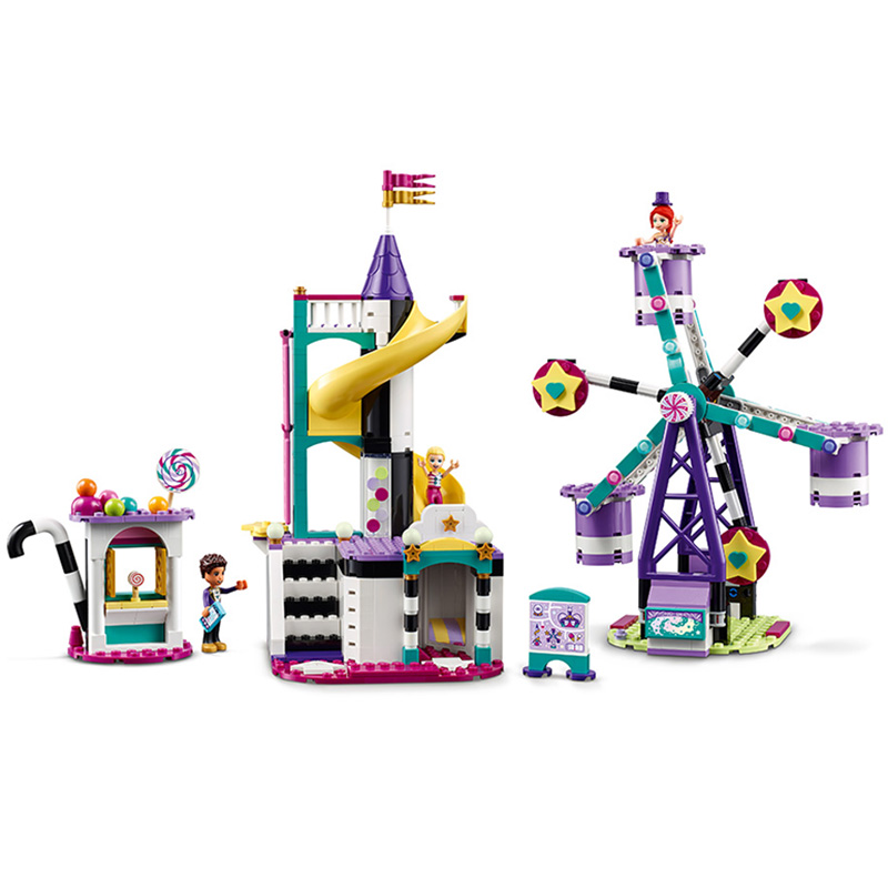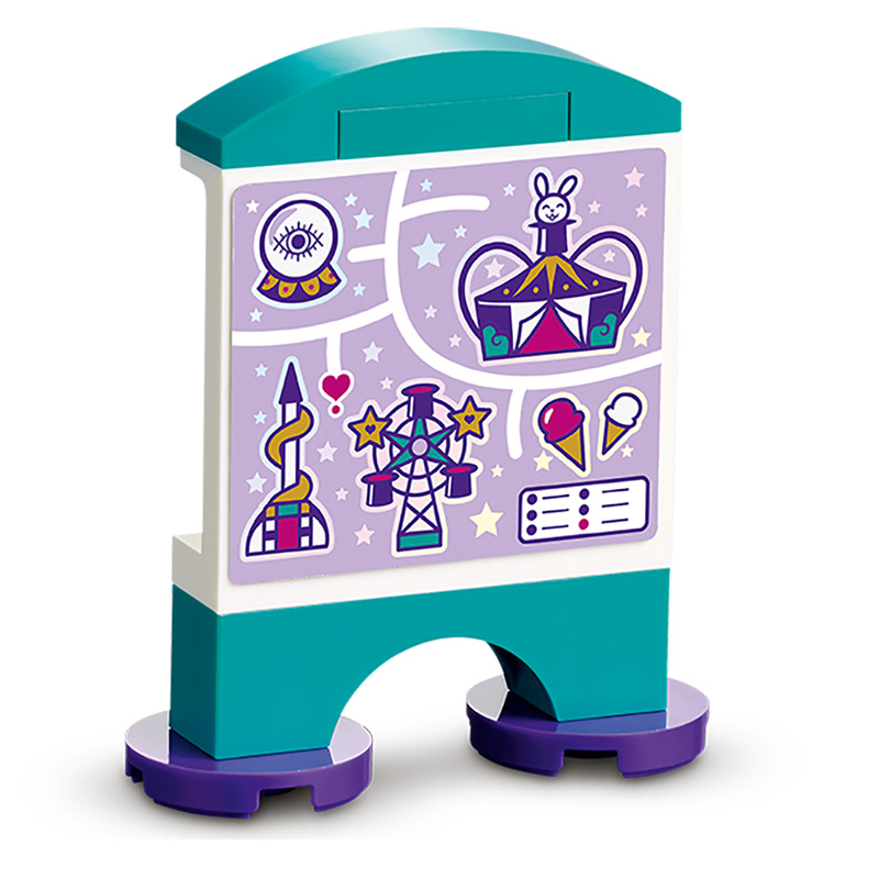 „Roată și tobogan magic” Setul vine cu 3 mini-păpuși LEGO® Friends îmbrăcate în haine echitabile și vopsele de față. Are, de asemenea, un kit creativ de carnaval, cum ar fi cluburi de jonglerie, o acadea, o pălărie de cilindru și o hartă a târgului. Vârsta recomandată: 7+ Număr de piese: 545 Piese