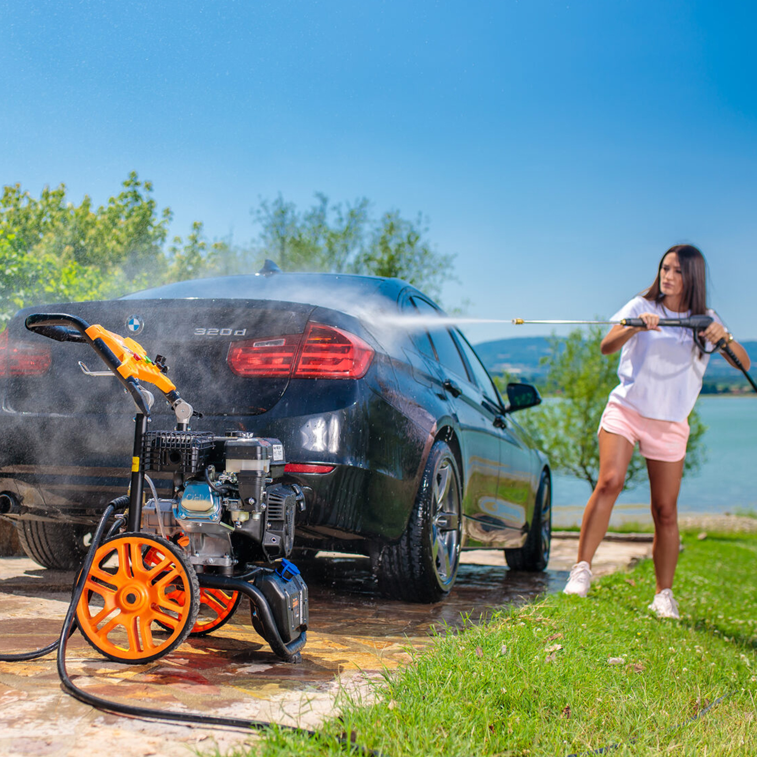 Mașina include un furtun de presiune de 10 metri, oferind o rază de acțiune mare, ceea ce o face potrivită pentru utilizare pe suprafețe extinse sau în locuri de dificil acces. Pistolul profesional inclus garantează un control mai precis al fluxului de apă, iar recipientul pentru detergent facilitează adăugarea de soluții de curățare pentru îmbunătățirea performanței.