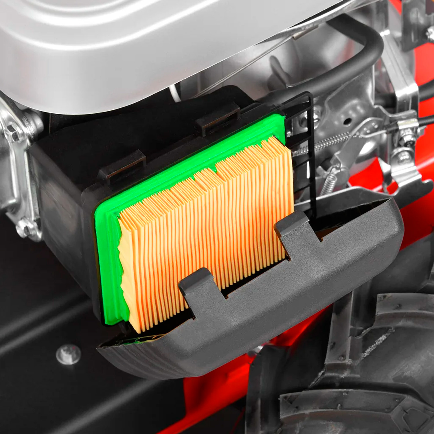 Construită pentru stabilitate și manevrabilitate, această motocositoare cu tambur este dotată cu roți robuste de 16x3,5–8”, care garantează o deplasare ușoară chiar și pe suprafețe moi sau denivelate. Ghidonul ergonomic, căptușit și pliabil oferă confort sporit și facilitează transportul și depozitarea.