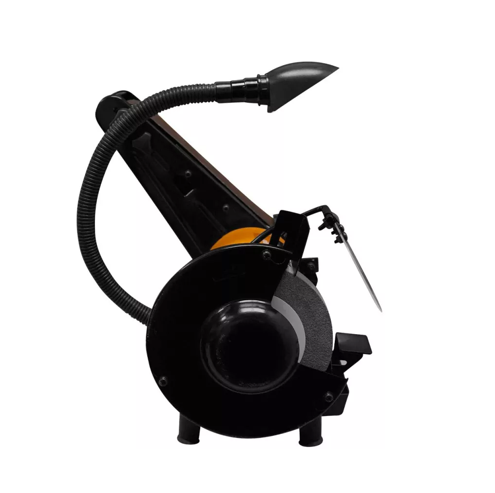 Această combinație permite lucrul cu o varietate de materiale și forme, de la muchii la suprafețe plane. Aparatul dispune de o lumină de lucru integrată, care îmbunătățește vizibilitatea și precizia operațiunilor. Construcția solidă și greutatea de 11 kg oferă stabilitate și durabilitate în utilizare. Ideal pentru ateliere, garaje sau utilizatori casnici care doresc un polizor multifuncțional. Designul compact îl face ușor de amplasat pe bancul de lucru.