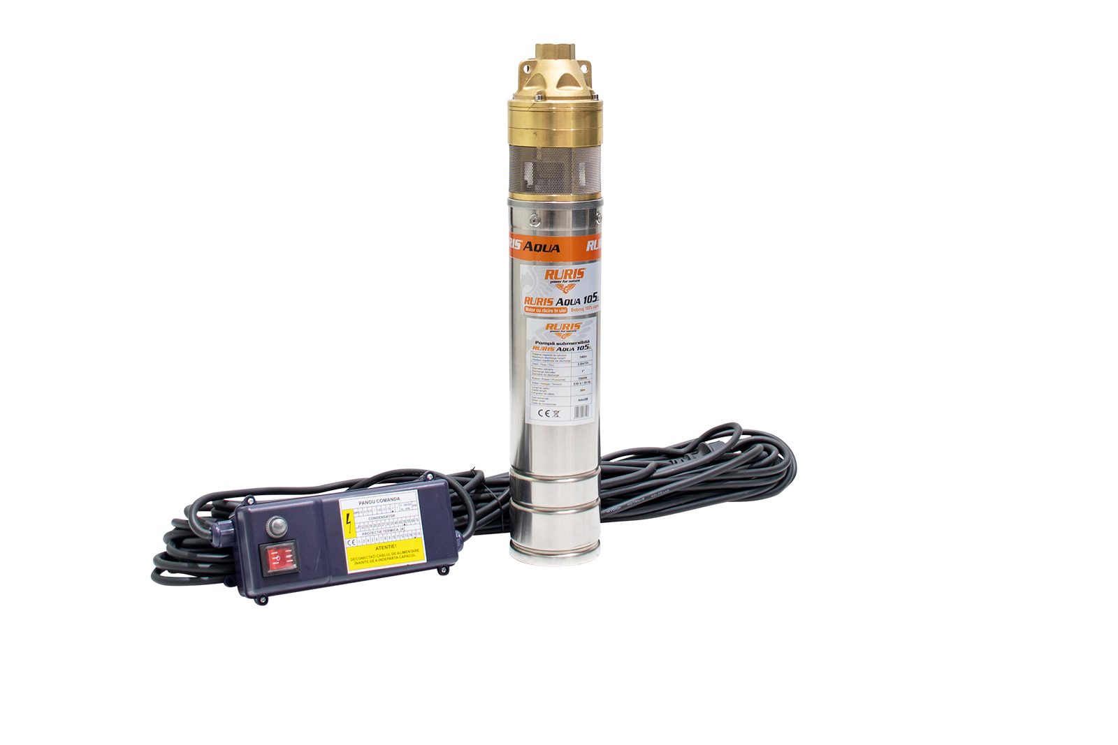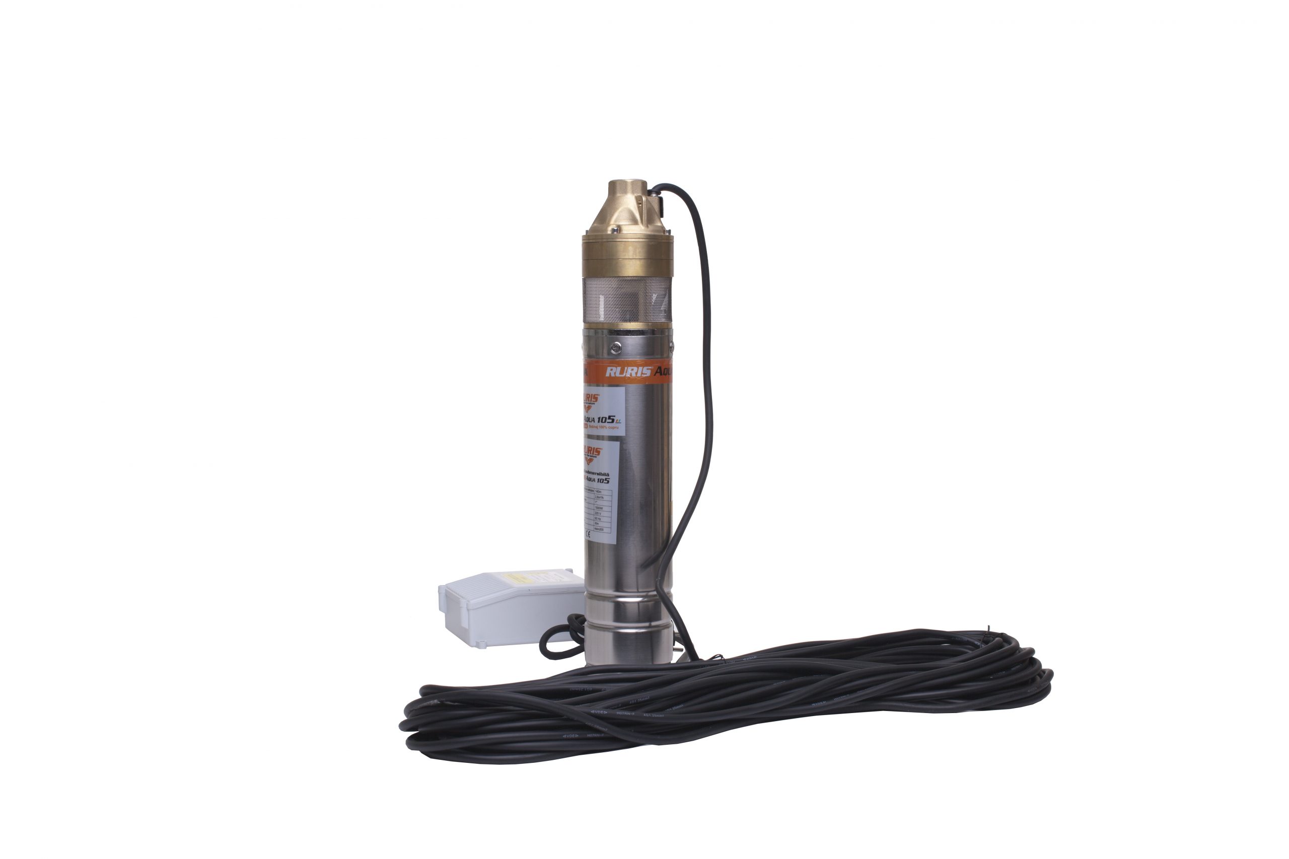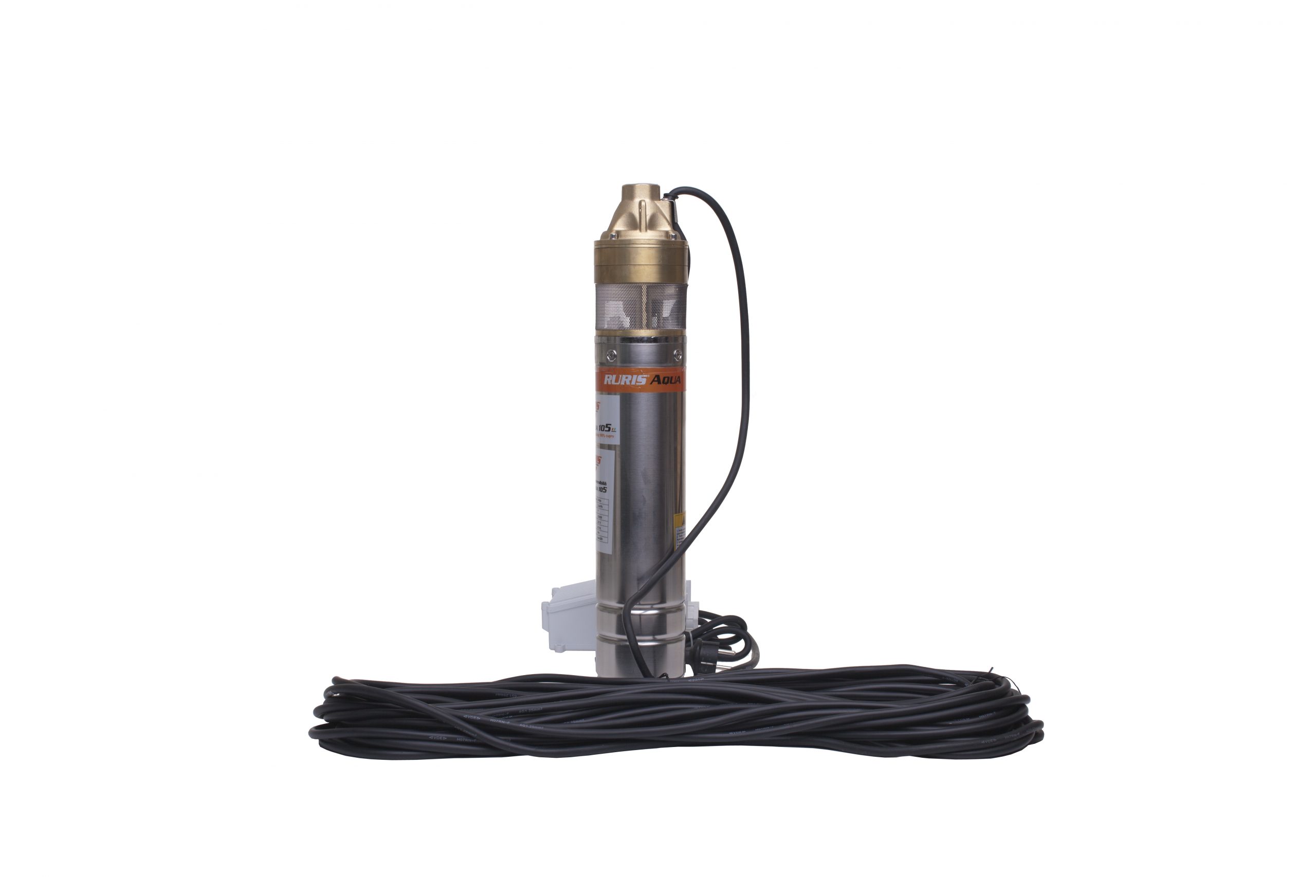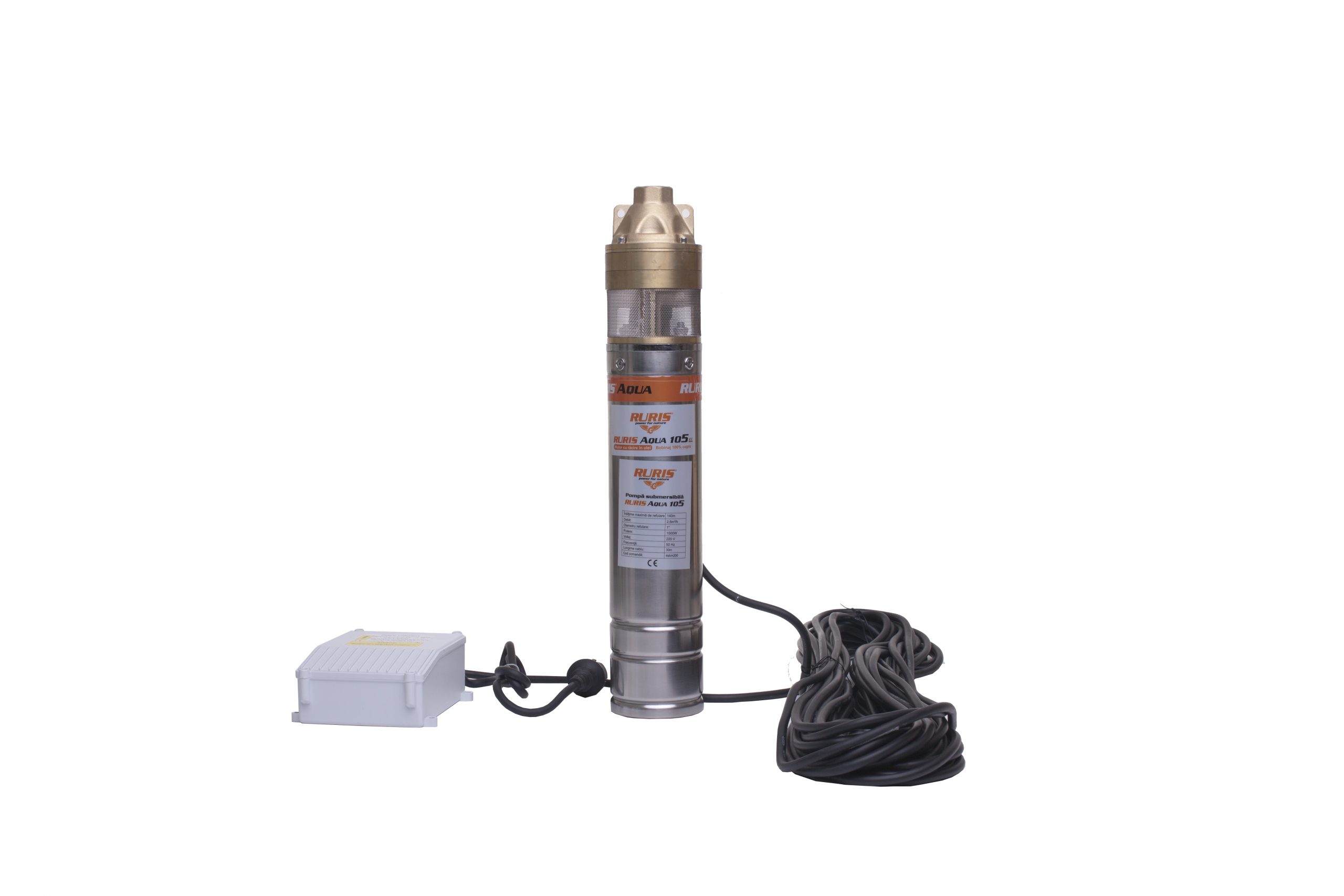 Pompa submersibilă RURIS Aqua 105 este realizată din inox, având motorul cu bobinaj 100% din cupru, în baie de ulei. Este o pompă cu turbină cu 3 etaje, având un debit de 45 l/min. Această pompă este adecvată pentru transferul apei curate din puţuri forate la adâncimi de maxim 140 m, alimentând mici sisteme de irigaţii sau diverse gospodării.Poate fi utilizată independentă sau ca parte componentă a unui grup hidrofor.Pompă submersibilă RURIS Aqua 105 se livrează cu panou de control şi un cablu de 30 m.
