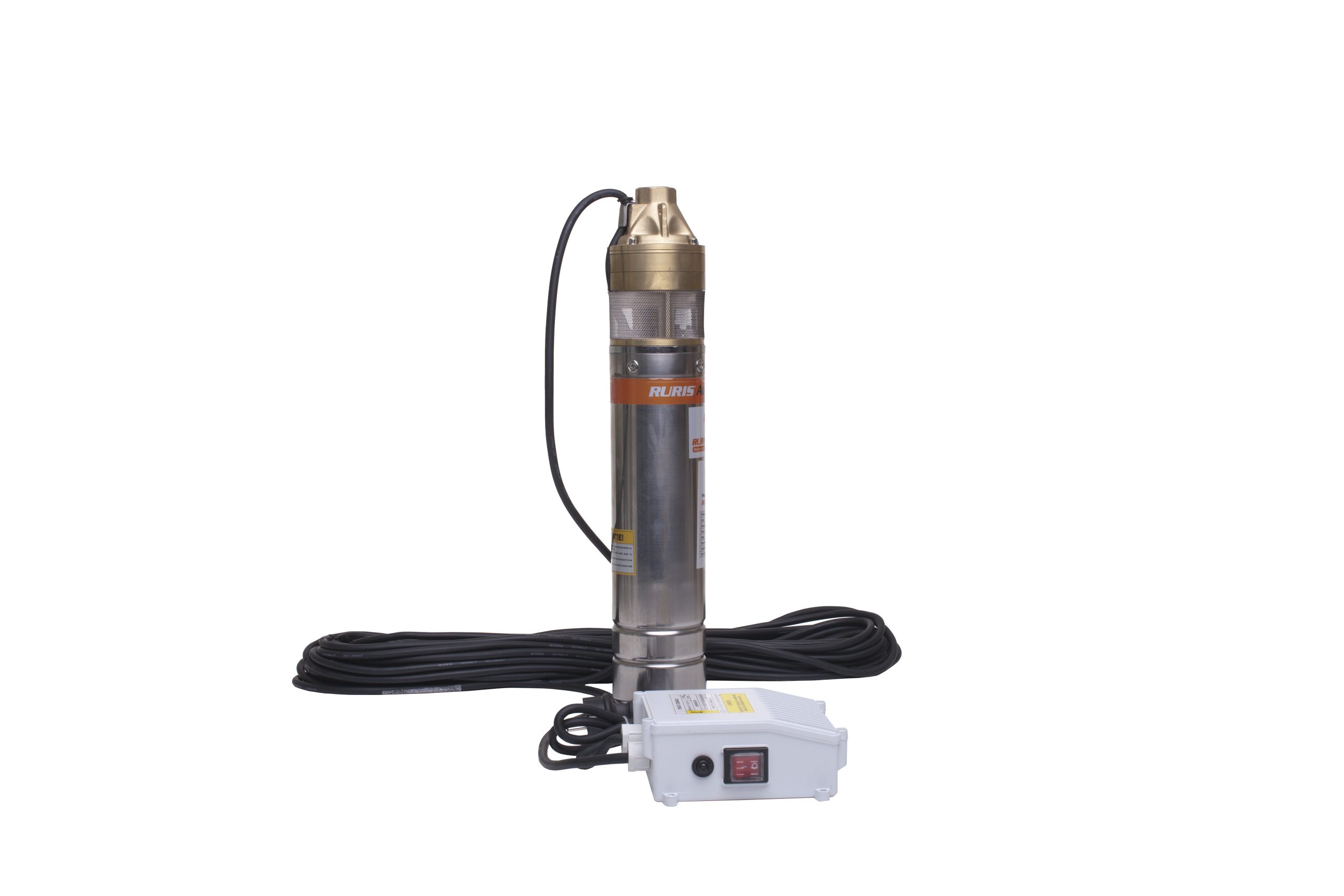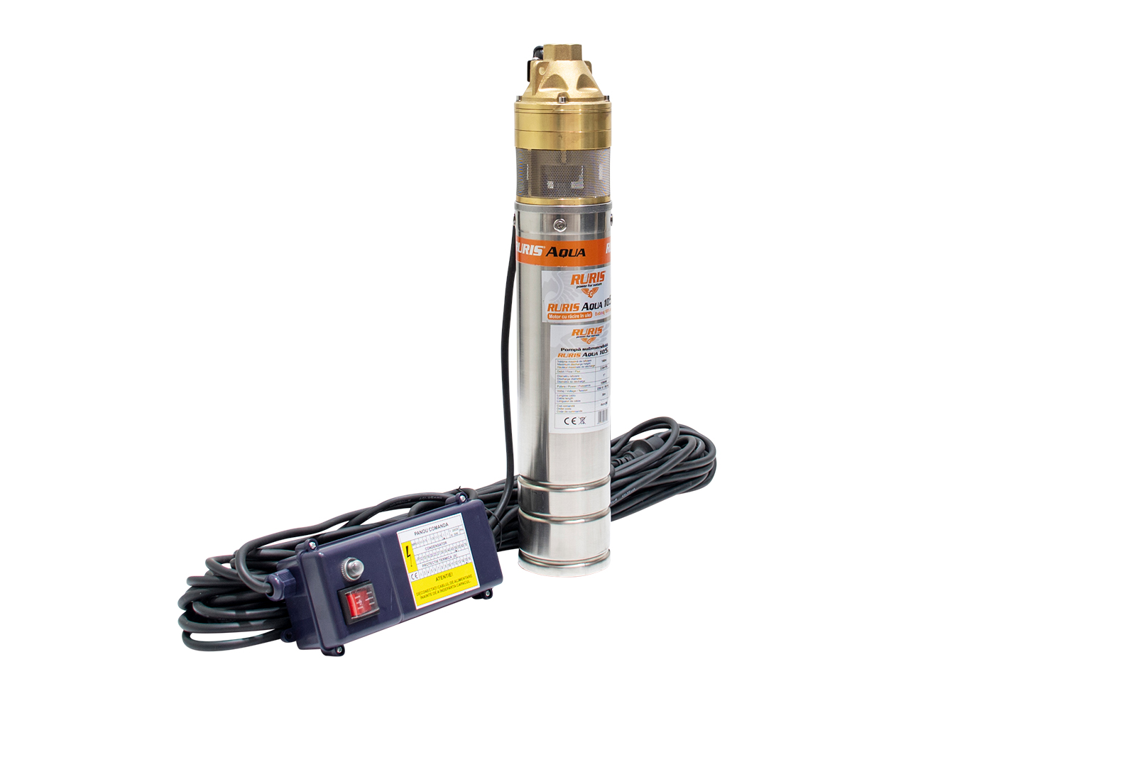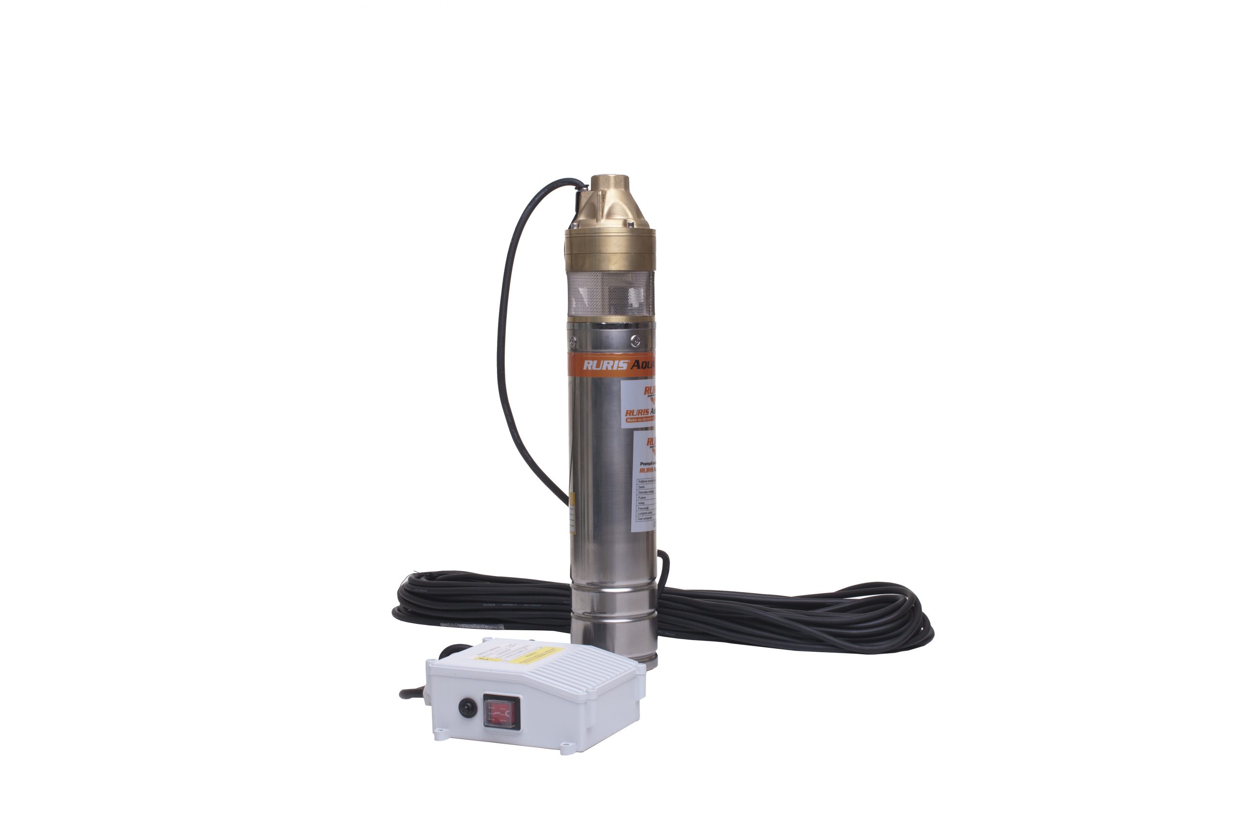 Pompa submersibilă RURIS Aqua 105 este realizată din inox, având motorul cu bobinaj 100% din cupru, în baie de ulei. Este o pompă cu turbină cu 3 etaje, având un debit de 45 l/min. Această pompă este adecvată pentru transferul apei curate din puţuri forate la adâncimi de maxim 140 m, alimentând mici sisteme de irigaţii sau diverse gospodării.Poate fi utilizată independentă sau ca parte componentă a unui grup hidrofor.Pompă submersibilă RURIS Aqua 105 se livrează cu panou de control şi un cablu de 30 m.
