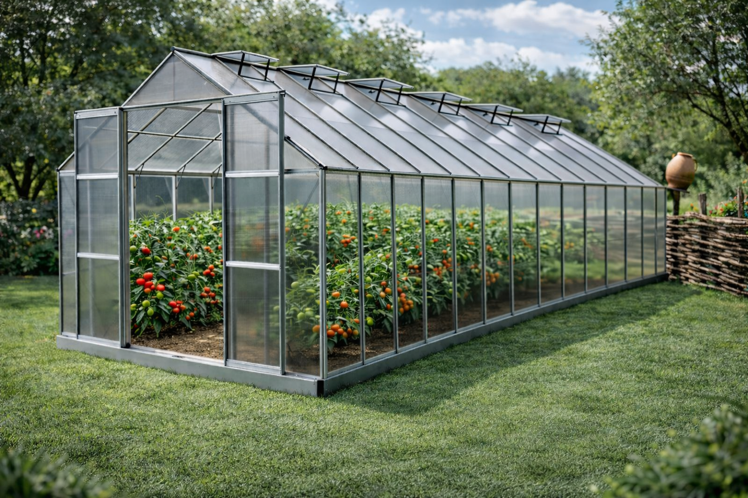 Cu dimensiuni generoase de 8,3 metri lungime, 3,1 metri lățime și aproximativ 2,5 metri înălțime, sera oferă suficient spațiu pentru diverse tipuri de plante, de la legume la flori sau răsaduri. Sistemul practic cu uși glisante duble la fiecare capăt (130 x 190 cm) permite acces facil și ventilație optimă, completată de cele 12 ferestre cu deschidere, care contribuie la menținerea unui climat interior echilibrat. Construcția inteligentă și materialele de calitate fac din această seră profesională pentru grădină o alegere excelentă atât pentru pasionați, cât și pentru utilizatori mai experimentați.