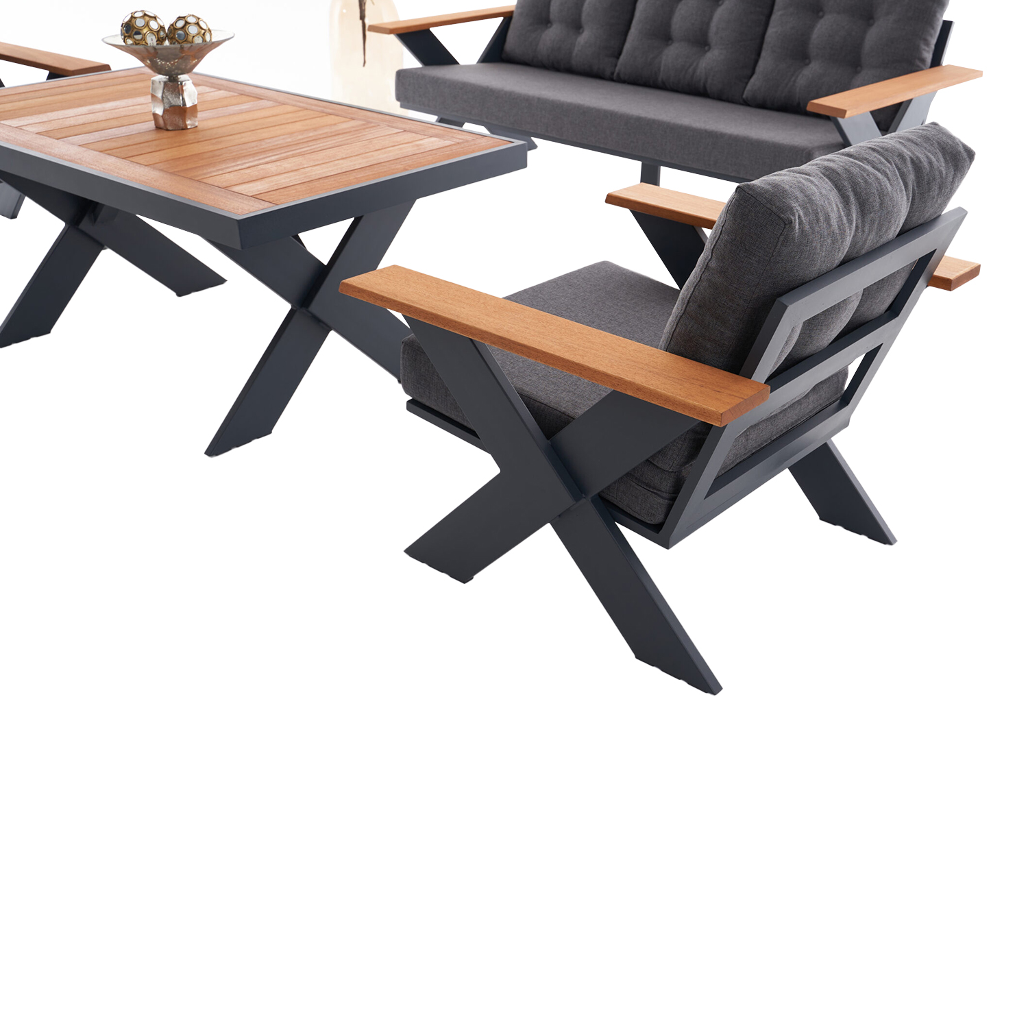 Mobilierul de grădină din seria TERRACE este un set elegant și practic pentru un timp confortabil petrecut în aer liber. Setul include două fotolii, o canapea, două pufuri și o masă, oferind astfel un loc confortabil pentru relaxare și socializare în exterior. Mobilierul este fabricat din aluminiu rezistent și lemn, asigurând durabilitate și rezistență la condițiile meteorologice. Culoarea gri conferă setului un aspect modern și stilat, care se integrează ușor în orice grădină sau terasă. Canapeaua are dimensiuni de 200x80x70 cm, iar șezlongul măsoară 80x80x70 cm, oferind spațiu și confort pentru cinci persoane. Masa, cu dimensiuni de 140x80x61 cm, este ideală pentru a așeza băuturi, gustări și alte obiecte necesare. Pernele din poliester adaugă confort suplimentar și sunt ușor de curățat. Blatul din lemn conferă setului un aspect natural și cald, fiind perfect pentru utilizarea în diferite condiții meteorologice. Mobilierul TERRACE este soluția ideală pentru a crea un colț confortabil în grădina sau terasa dumneavoastră, unde puteți savura momente de relaxare și socializare alături de cei dragi. Simplitatea întreținerii și designul elegant fac din acest set un element de bază pentru decorul dumneavoastră exterior.