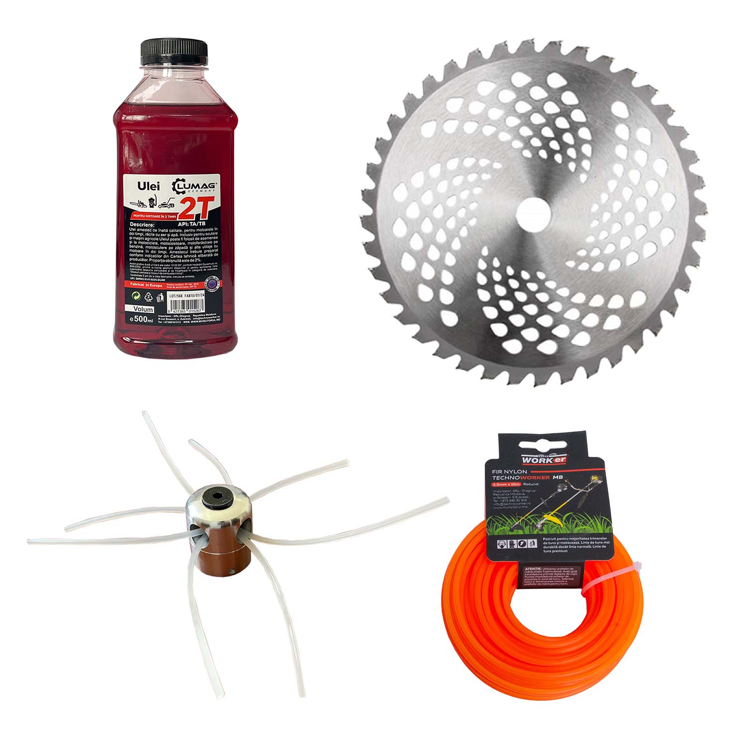 Setul este completat de uleiul Lumag 2T, 0.5 L, produs în Europa, destinat motoarelor în doi timpi. Se utilizează în amestec 1:50 (2% ulei), dacă producătorul nu recomandă altfel, asigurând lubrifiere eficientă și protecție optimă a motorului. Se poate depozita la maximum 40°C, cu termen de garanție de 5 ani de la data fabricației.