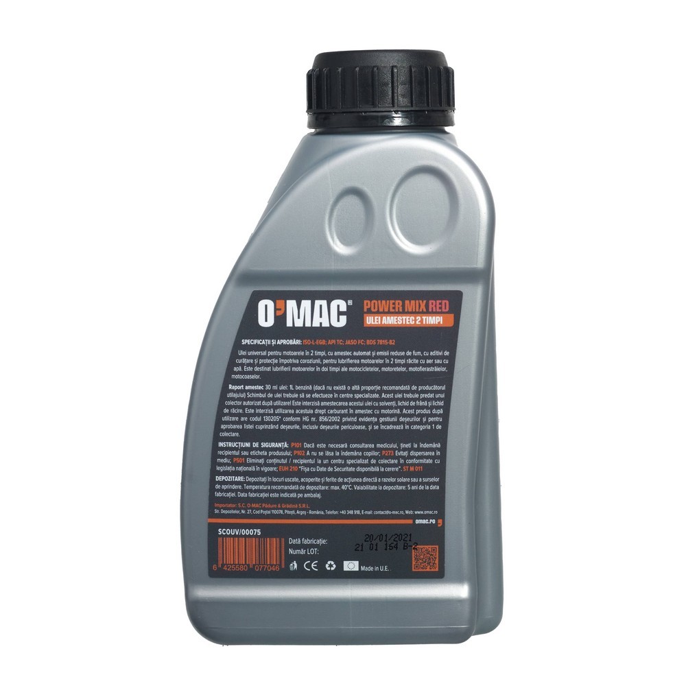 Uleiul O-MAC este un ulei universal pentru motoare in 2 timpi, cu amestec automat si emisii reduse de fum, cu aditivi de curatare si protectie impotriva corziunii. Se utilizeaza pentru lubrifierea motoarelor in 2 timpi, racite cu aer sau cu apa.